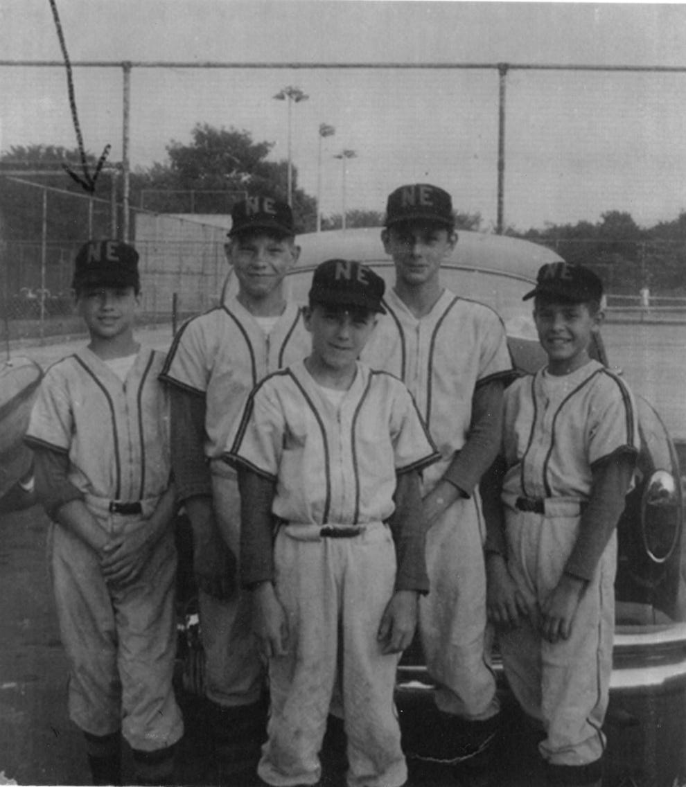 Our uniforms, the finest of any team in town, came complete with those baseball undershirts, white with colored sleeves, and major league style baseball socks with the high thin stirrup of the big leaguers, not those two-tone, low-down little league socks that the other teams wore and that looked like the kind of socks Ty Cobb or Roger Hornsby wore back in ancient times. Tom bought the uniforms, clothed us, with what he earned at his foreman’s job at the nearby shirt mill. He bought our bats, balls, catcher’s equipment. We were his team. We wore our hats with NE on them proudly, unaware that we had been bought, too. Every kid in town saw those uniforms and wanted to play for us. Parents, thankful that “somebody cares enough to do something for these kids” mistook Feifel’s reticence, his lack of eye contact, for modesty, or as embarassment at their expressions of gratitude, and this meant to them that “his heart’s in the right place,” that he wasn’t trying to make a reputation for himself, wasn’t asking for their votes, their business, their money. “He does it for the kids.” In our black and gold spiffy uniforms (“your baseball suit” my mother called it) we flacked for Feifel as surely as the other teams who had the names of banks and beer distributors and bowling alleys stitched across the back of their shirts. The man knew his business, even if nobody else did.